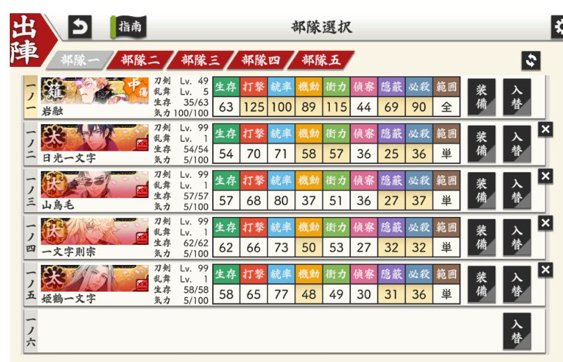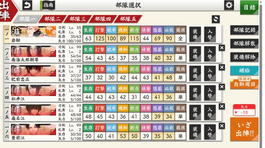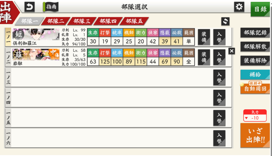 いや~…隊長経験値で上げた倶利伽羅江くん以外まっかっか、赤疲労ごめんね…でも効率いいから…ウンゴメン…
